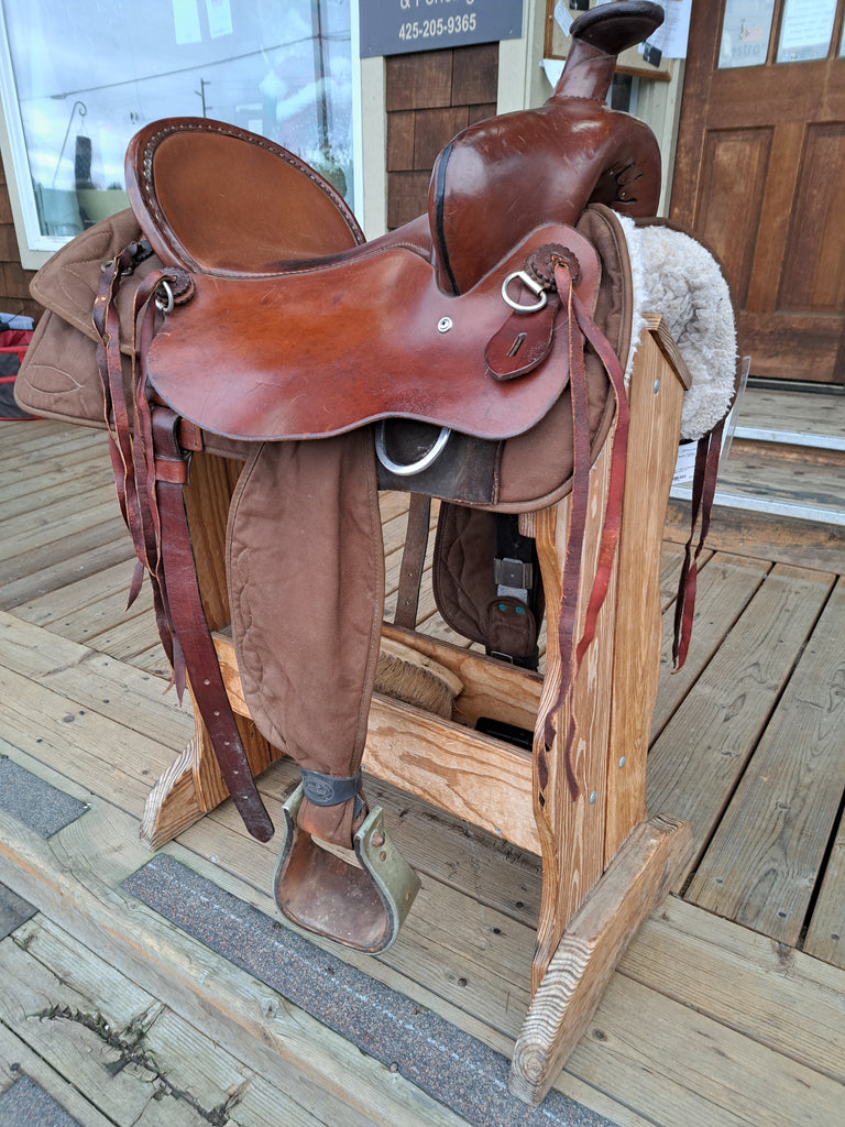 This is a Circle Y Cordura Park & Trail Western Saddle in fair used condition. This saddle comes with a latigo, stirrups, and hobbles. It is equipped with cordura fenders and skirt to reduce weight.