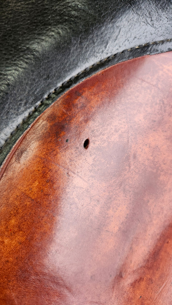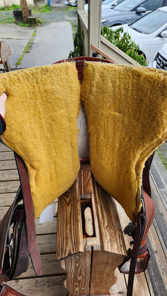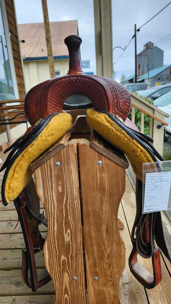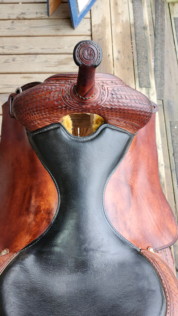 This is a Dale Chavez Ranch Cutter Saddle in excellent used condition. This saddle is priced to move, so don't wait to add it to your cart! It features a lovely padded seat and easily adjustable fenders. It comes equipped with a latigo, off billet, and flank straps. It is finished with basketweave stamping, a barbed wire tooled border, and silver conchos. *We did note that there is a small hole on the jockey part of the seat. See pic*