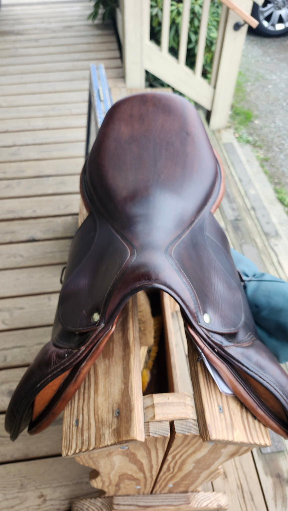 This is a Devoucoux Jump Saddle in good used condition. This saddle is made with quality leather that is soft and grippy. It comes with a devoucoux saddle cover.