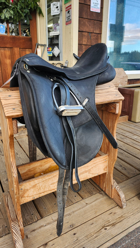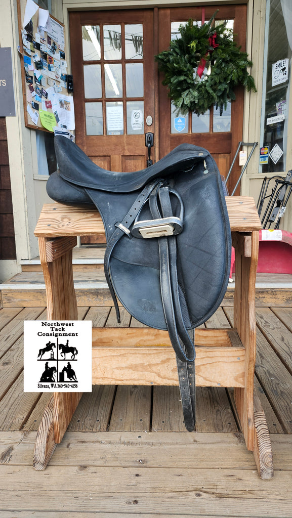 This is a Wintec Isabell Werth dressage saddle in fair used condition. This saddle does have some minor stains and scuffs, but still has plenty of life left in it. It features CAIR panels and a exchangeable gullet sustem. It comes equipped with stirrup leathers and irons.