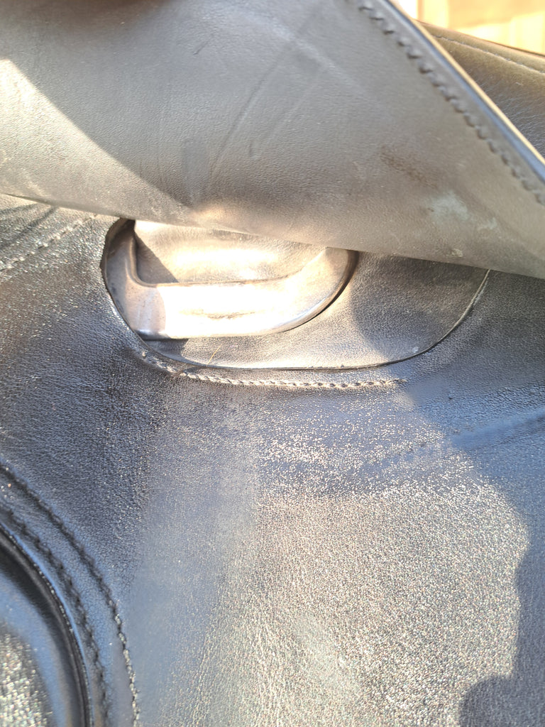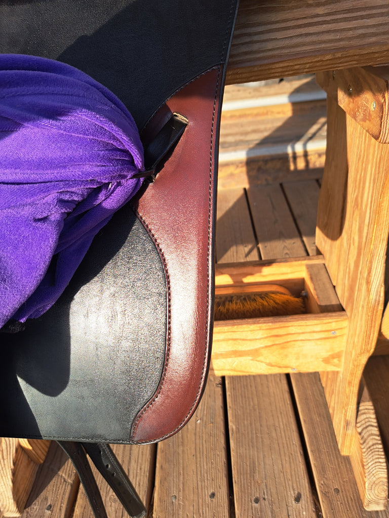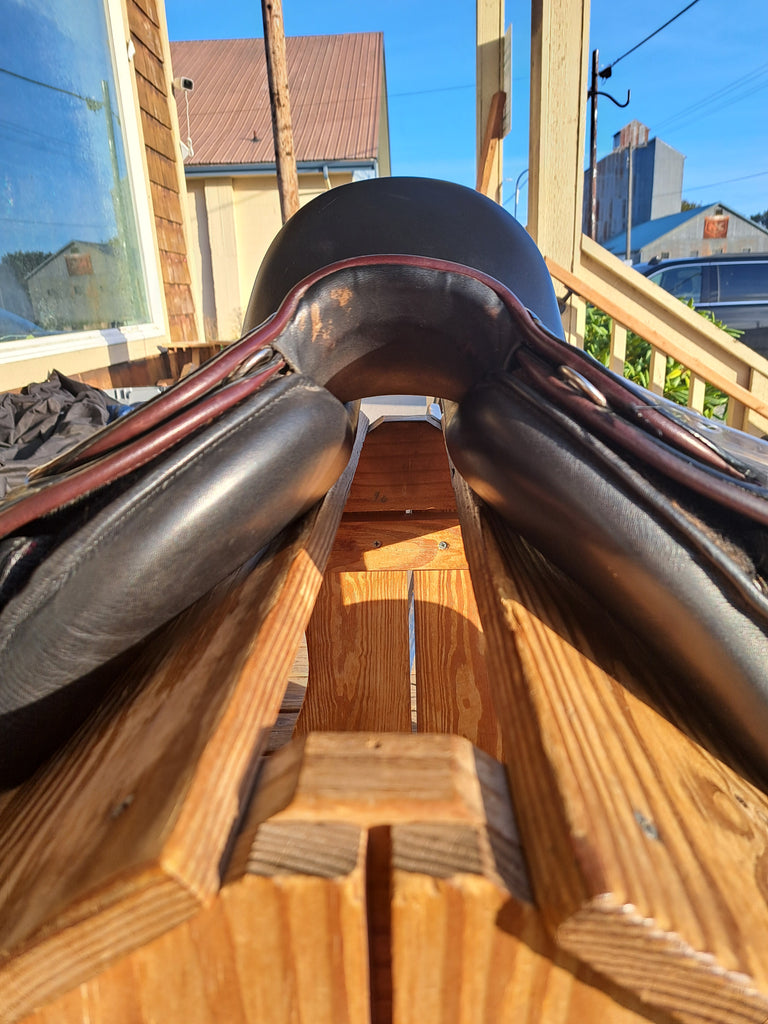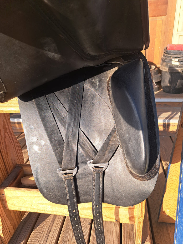 This is a 18" DT Saddlery Butterfly Dressage Saddle ibn good used condition. This saddle features lovely two tone leather and crystal accents. This saddle tree is hinged in two places, which allows it to fit a large variety of horses.