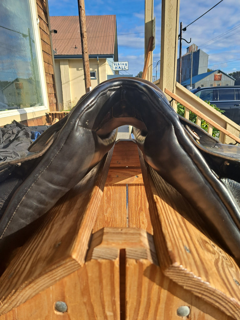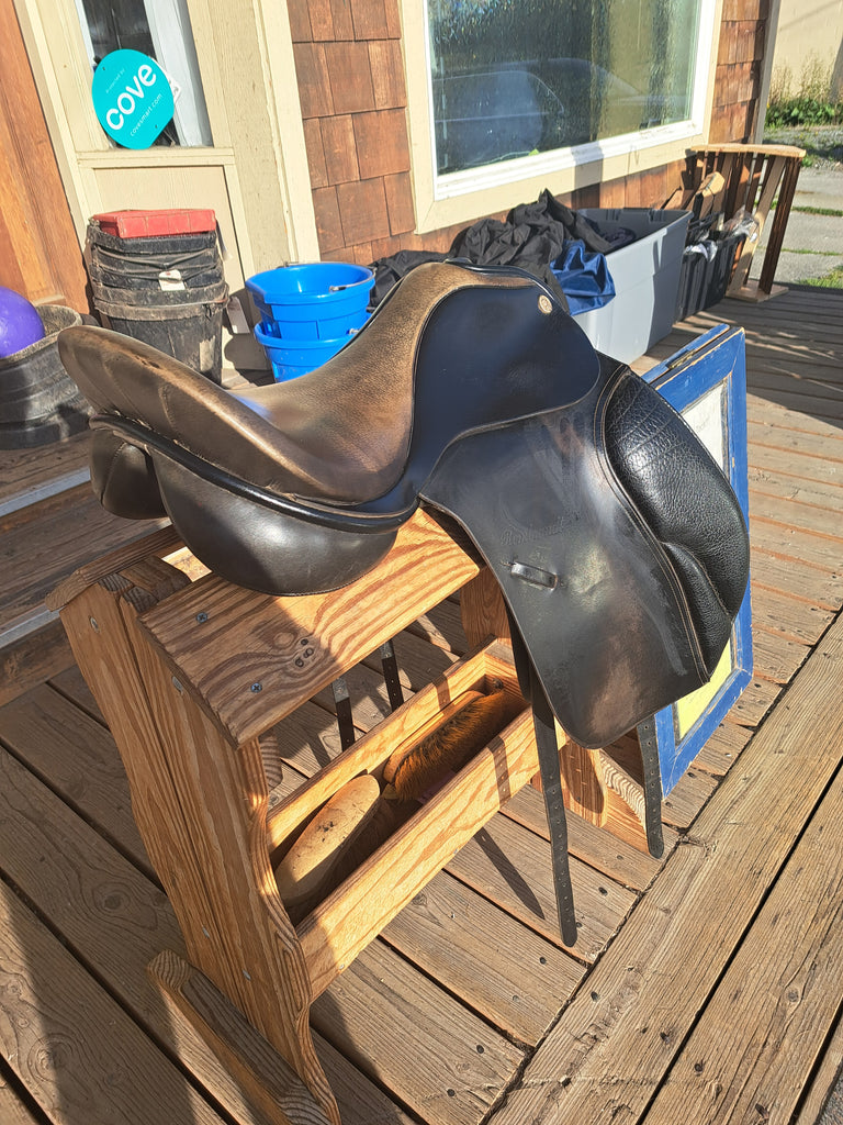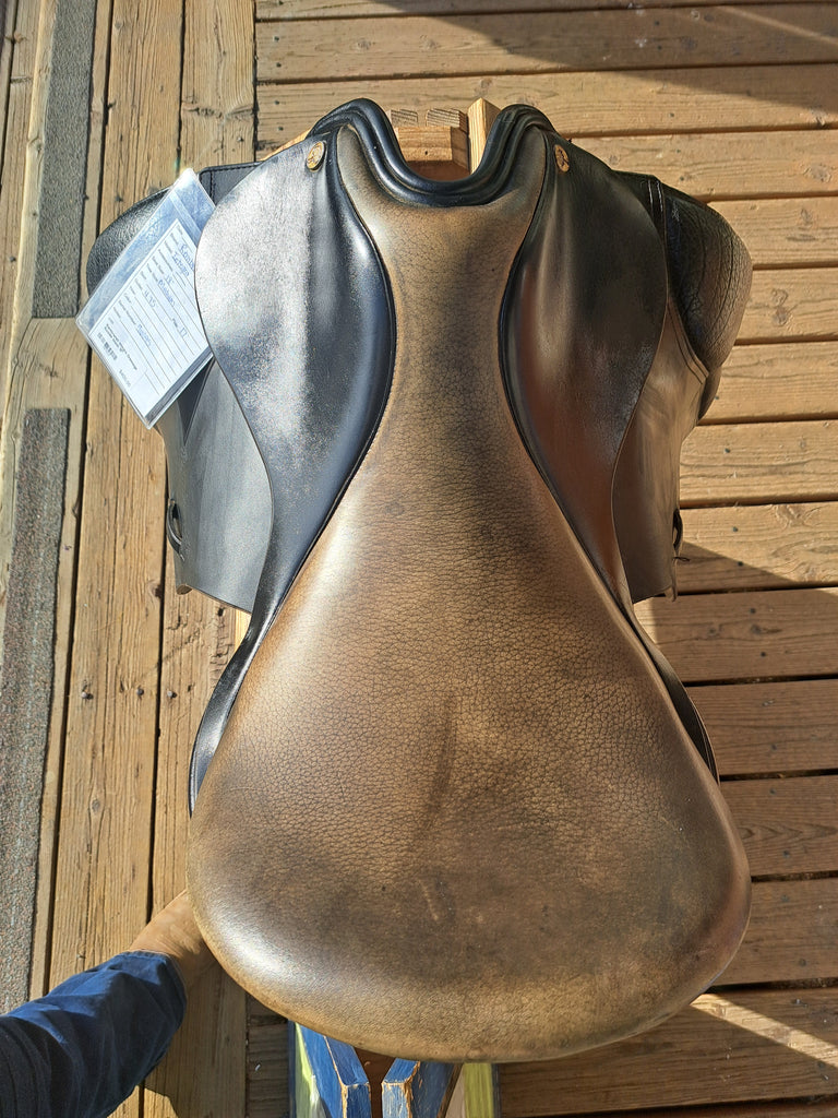 This Rembrandt Integra Dressage Saddle has been well loved and is in good used condition, showing normal signs of wear and discoloration.