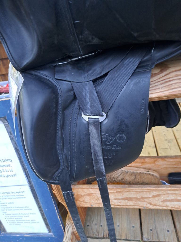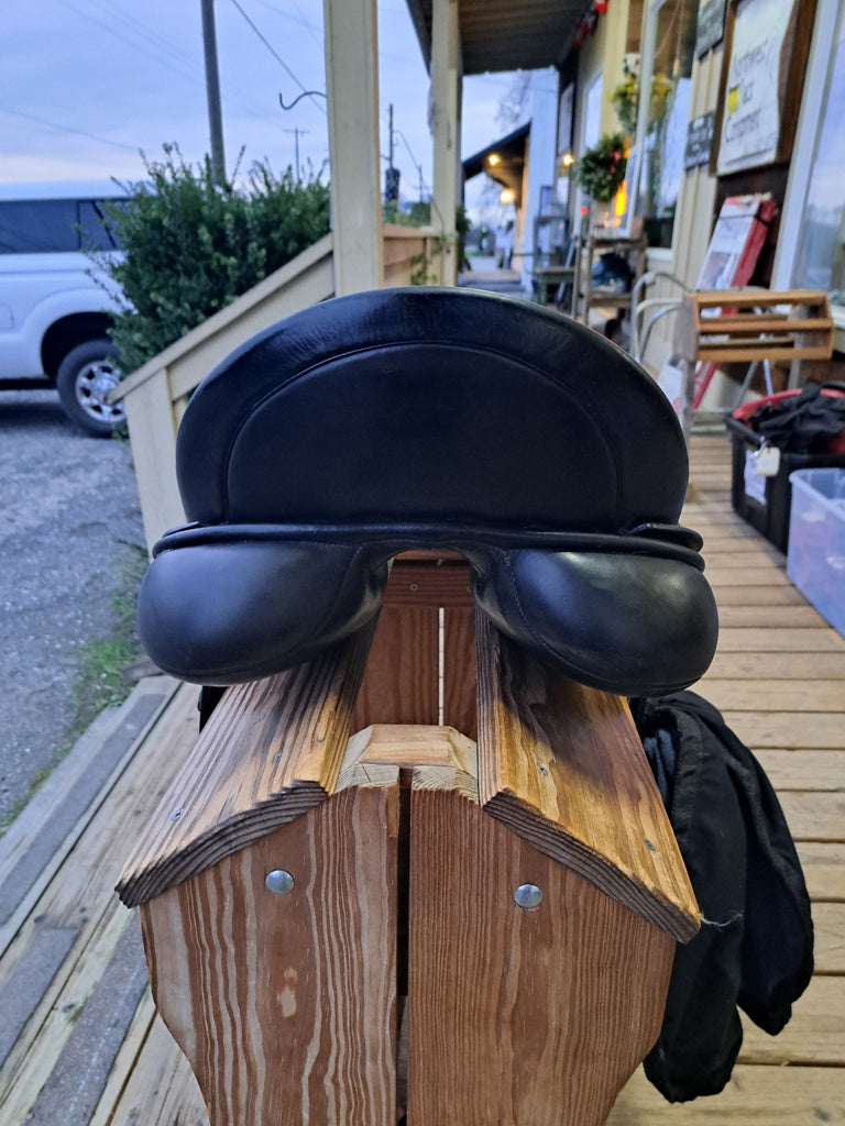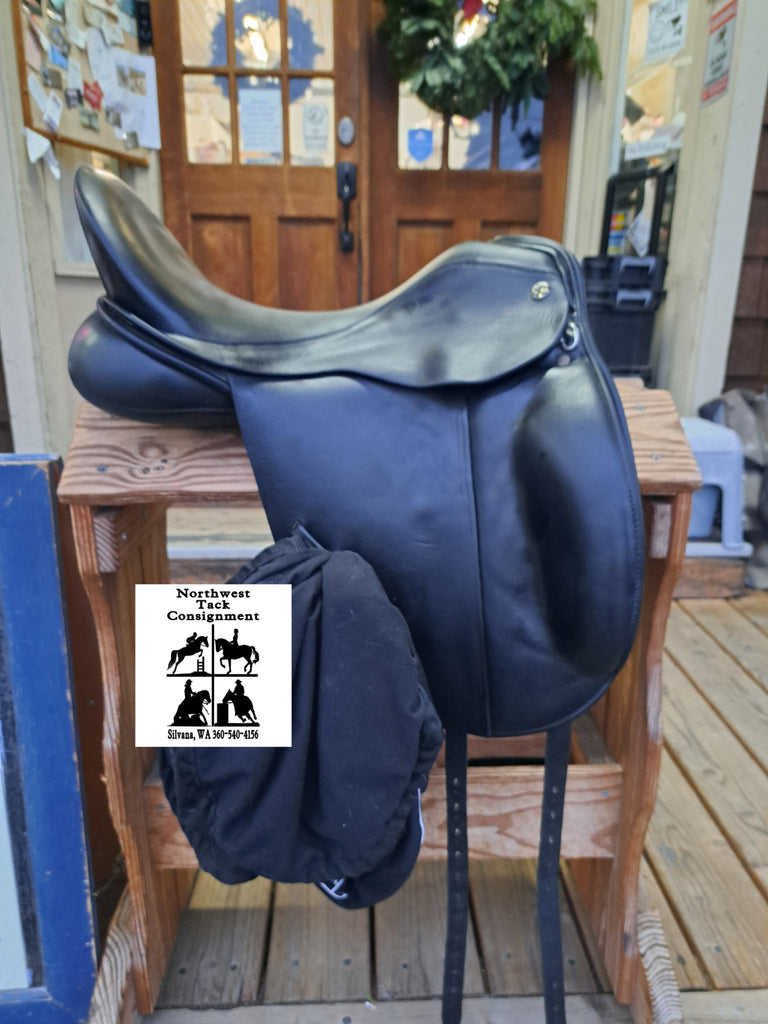 This Trilogy Verago Elite Dressage Saddle has been well cared for and is in good used condition. It features a deep seat with a narrow twist and well supported bone seat area. It comes with a saddle cover.