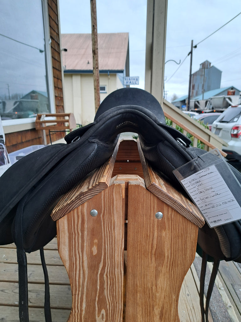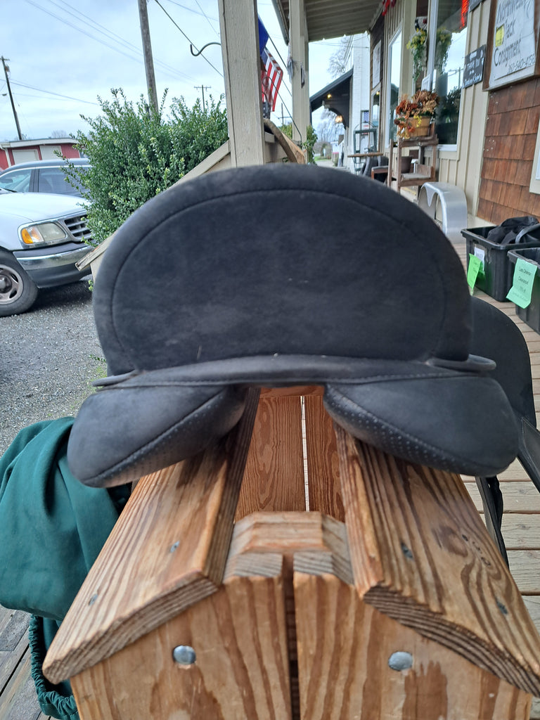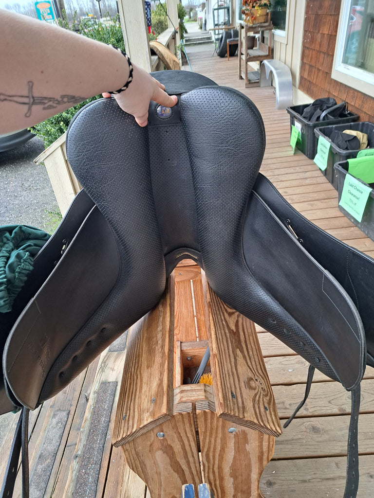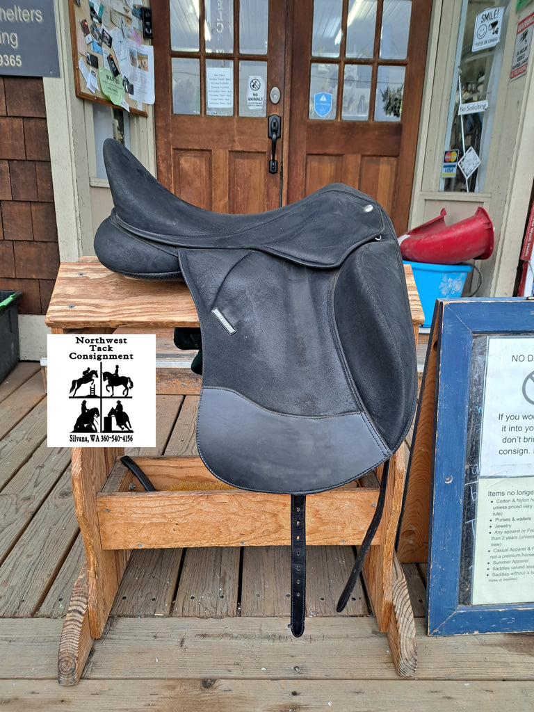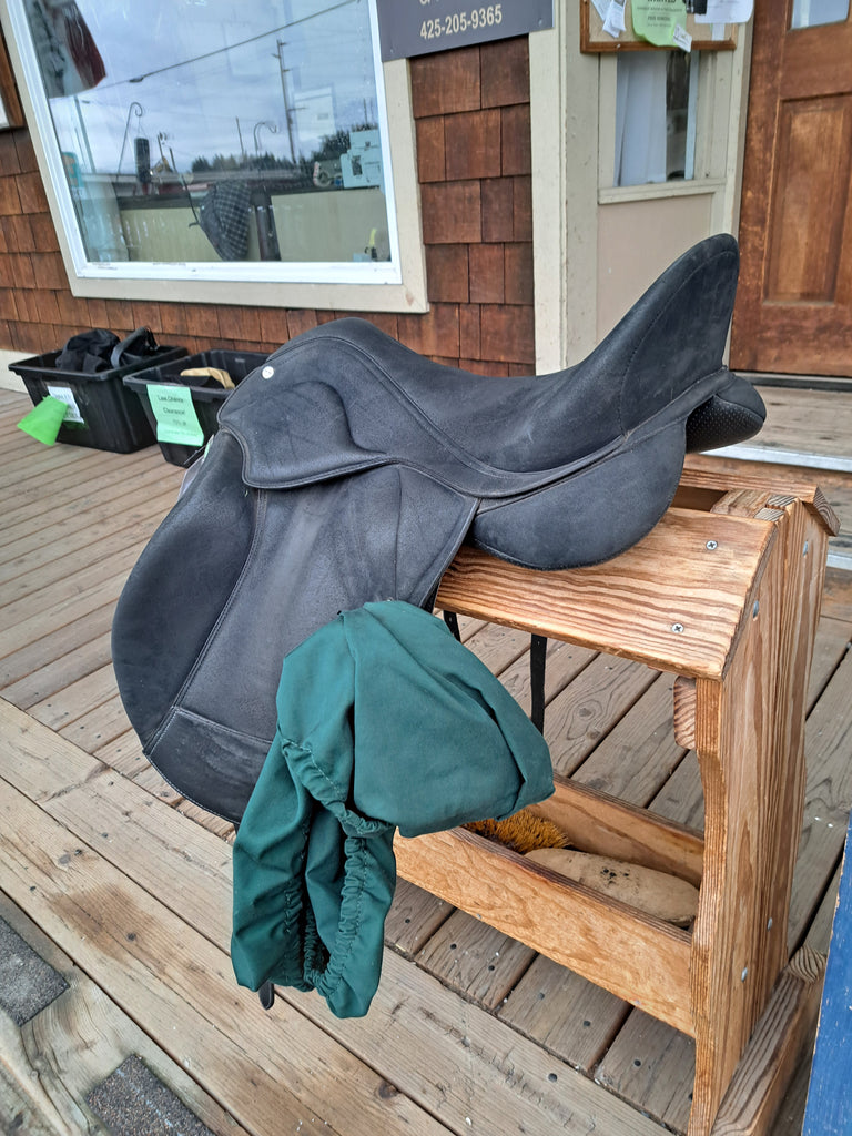This is a Wintec Pro Contourbloc Dressage Saddle in good used condition. This saddle features an exchangeable gullet system and CAIR panels. It comes with a green saddle cover.