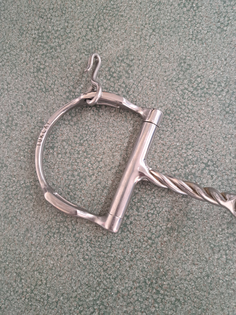 This is a used but still in very good condition mylers d ring with twisted mouth piece single break snaffle.