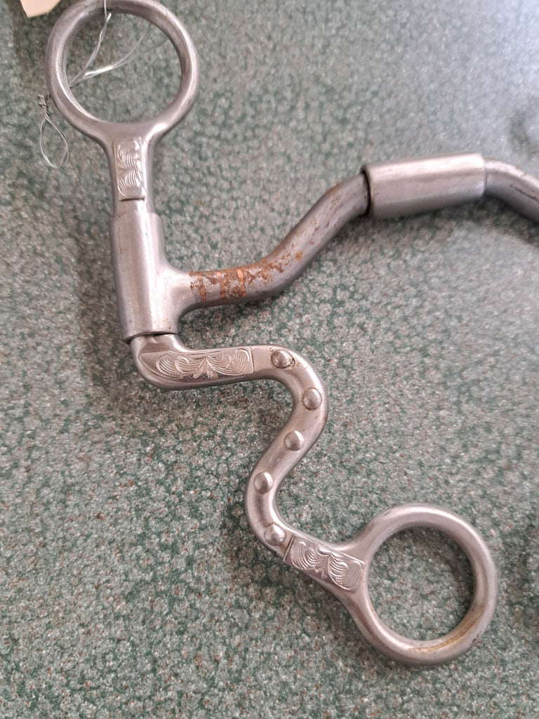 This is a used but still in good condition fg low port futurity bit with studs and silver plates with engraving