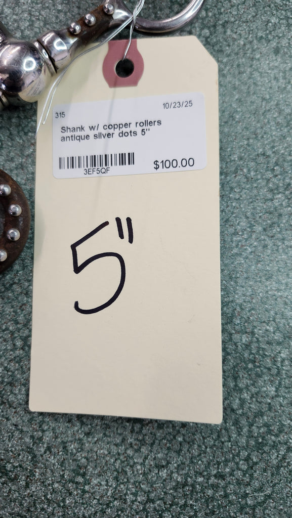 This 5" Hank with Copper rollers and antique silver dots is in great used condition. Comes with curved shank and hinge mouth piece.