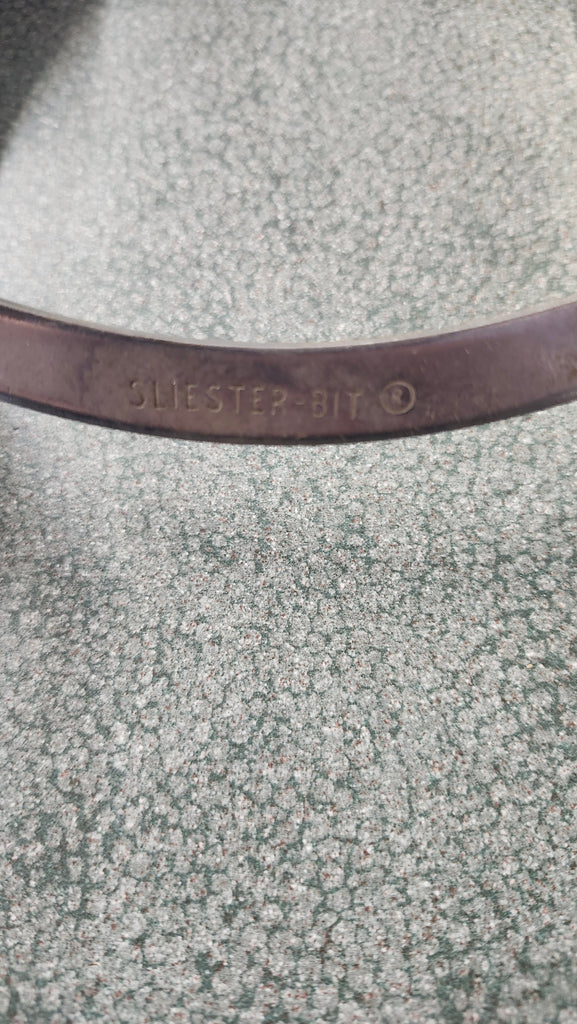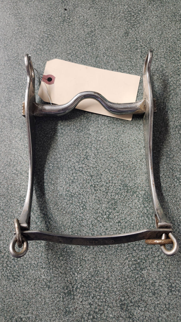 Sliester bits have a long lasting reputation in the western world for being quality, long lasting, and attractive bits. This bit is in very good used condition. Very low port that is just 1 1/8″ tall that gives some tongue relief without much correction. Mullen mouth/fixed cheek. 5″ mouth made from a copper alloy material that is more durable than straight copper. This one has the standard 4-point design, swept back shanks at 8″ (Measures 9″ top bottom of rein ring).