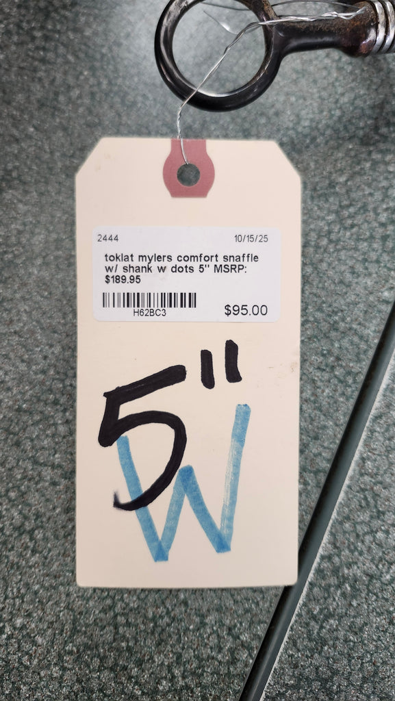 This 5" Toklat Myler Comfort Snaffle With shank is in great used condition. Comes with a curved shank an dots to line it.