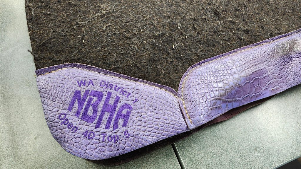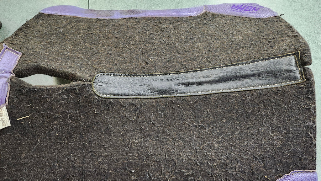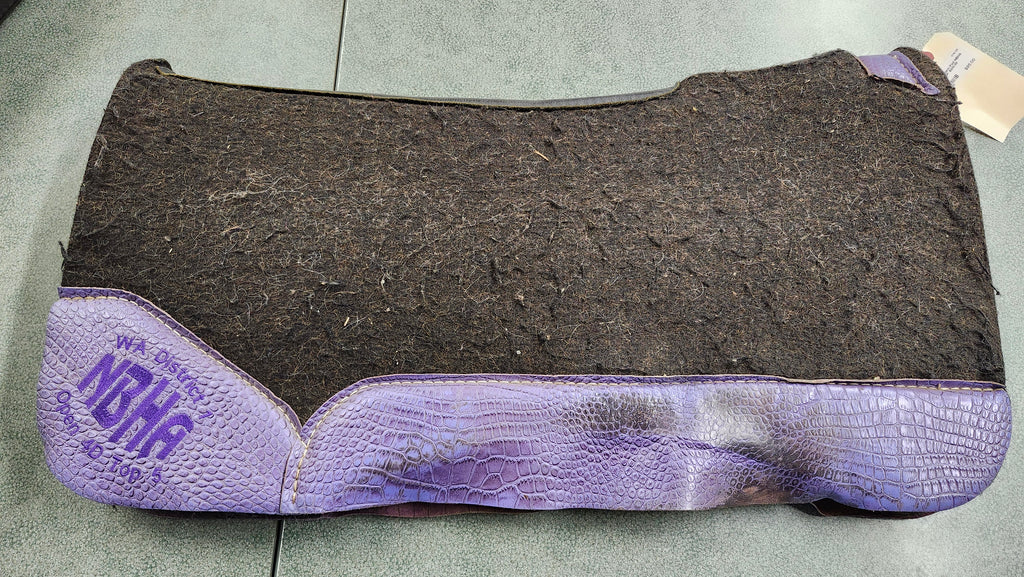 This is a used but still in good condition western pad with unique tooled purple leather wears. This pad is monogramed and is pretty dirty specifically on the underside but can be cleaned.