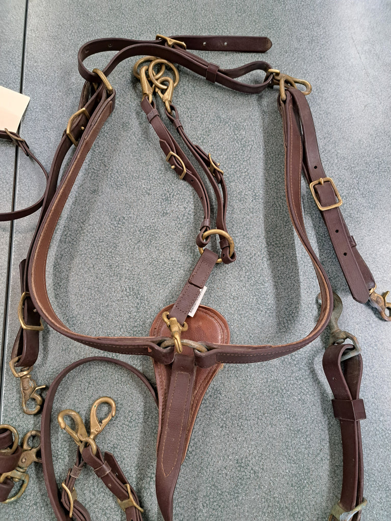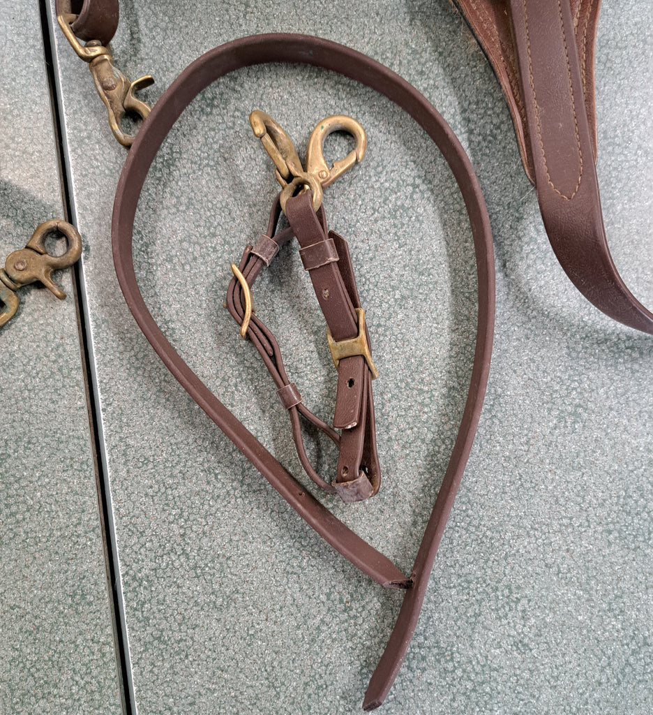 This is a used but still in good condition biothane set which includes a breastplate, halter, bridle, reins, and two bit holders. The hardware is showing signs of aging and wear but is still in useable condition.
