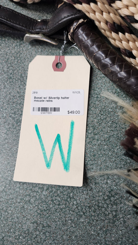 This Bosal With silvertip halter and mecate Reins is in great used condition. THe mecate reins are rope and the bosal and halter is dark oil.