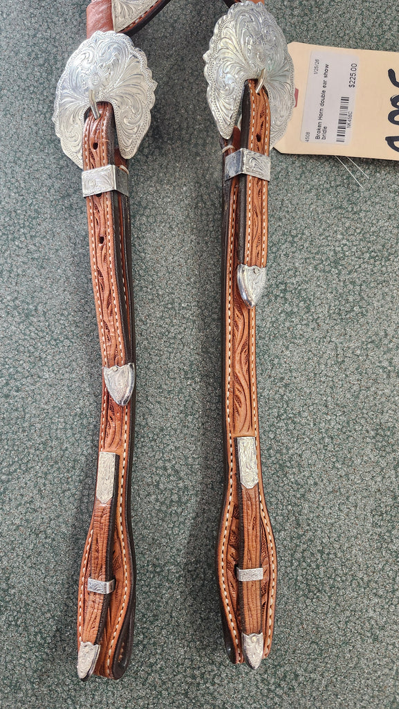 This is a used but still in good condition broken horn double ear show bridle. This bridle also features quick change ends along with silver engraving and tooling.