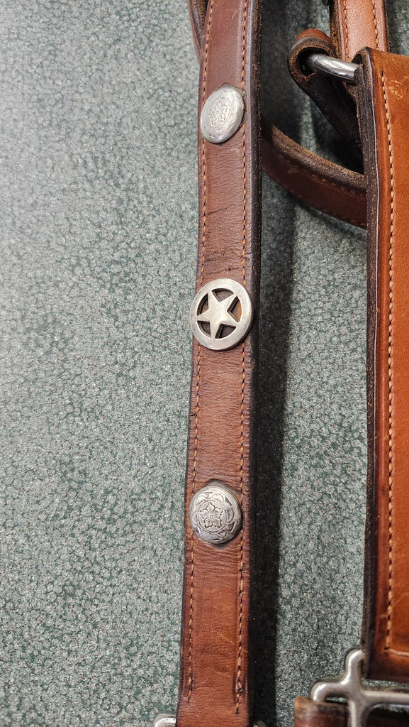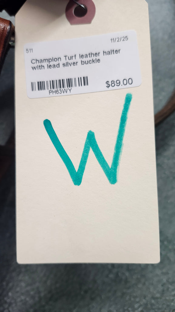 This Champion Turf Leather halter with Lead is in great used condition. The halter features a very simple design with silver only on the buckles and keepers. Coems with matching lead.