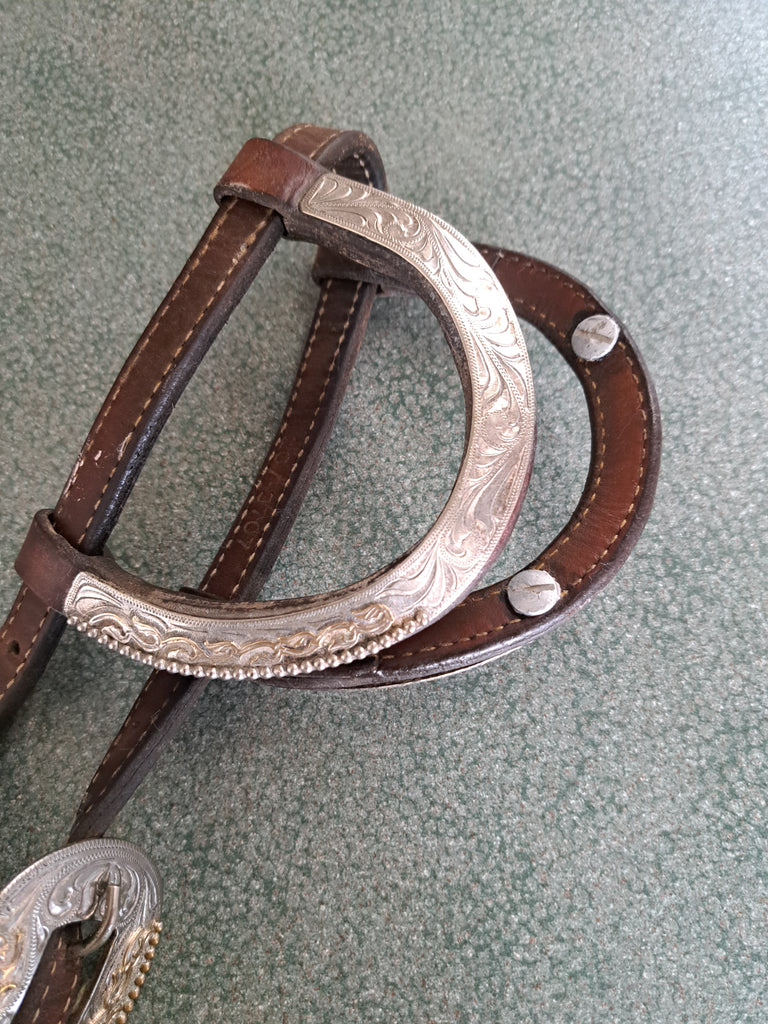 This is a used but still in good condition circle y double ear show bridle with silver engraving. This bridle could use a quick cleaning and polshing then it will be in excellent condition.