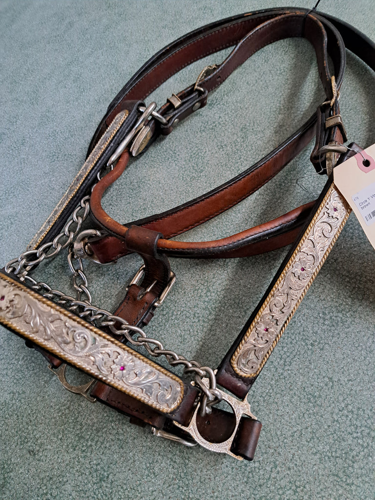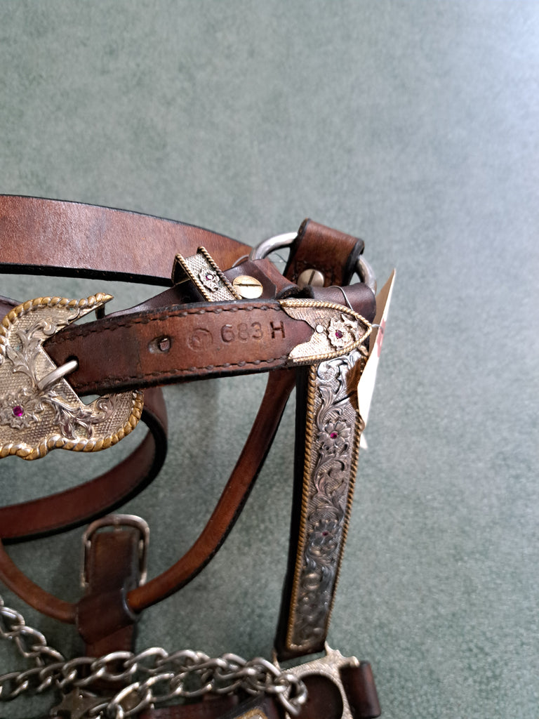 This Circle Y Vintage Show halter is in great used condition. The silver has gold outline with pink stones in the center. Comes with a show lead and chain.