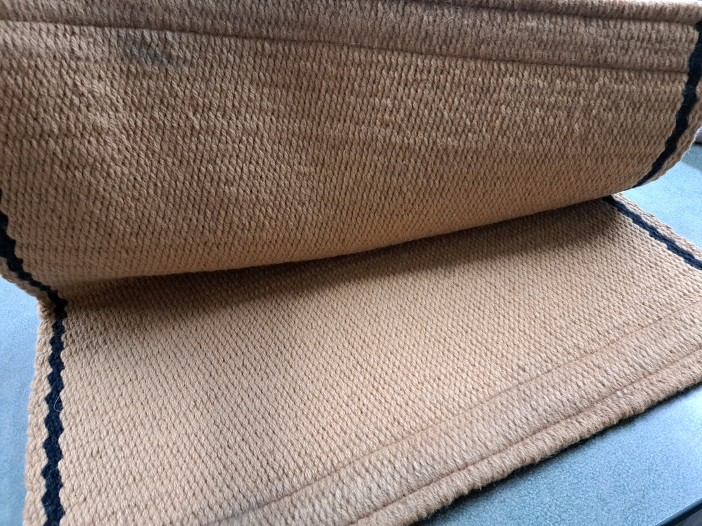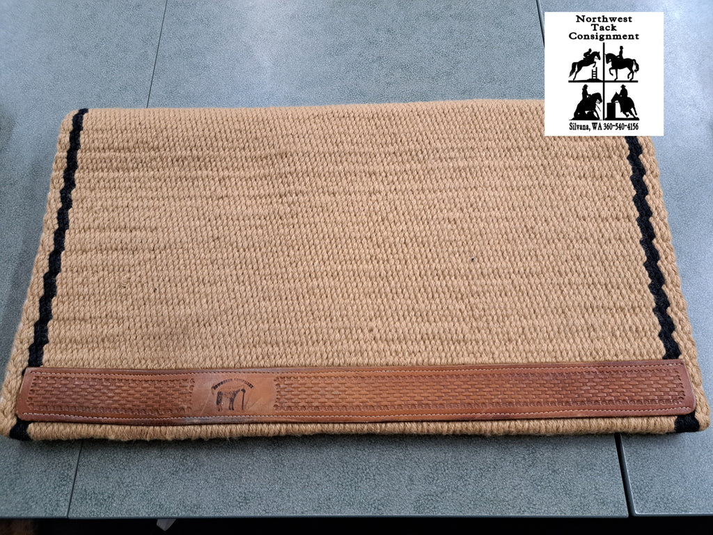 This Cowhorse custom saddle blanket features a simple tan with a black border pattern as well as a tooled and stamped wear leathers.