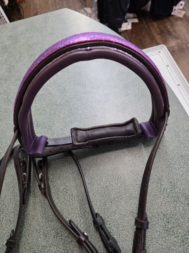 This is a custom made dressage bridle in gently used condition. We did want to note that the bridle leather pieces are both black AND brown. The crown piece is black, while the noseband is brown. It is then accented with purple leather and beading.