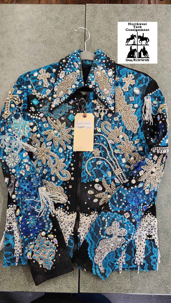 This stunning show jacket is in great used condition and features a stunning blue lace over a black base as well as silver rhinestone accents.