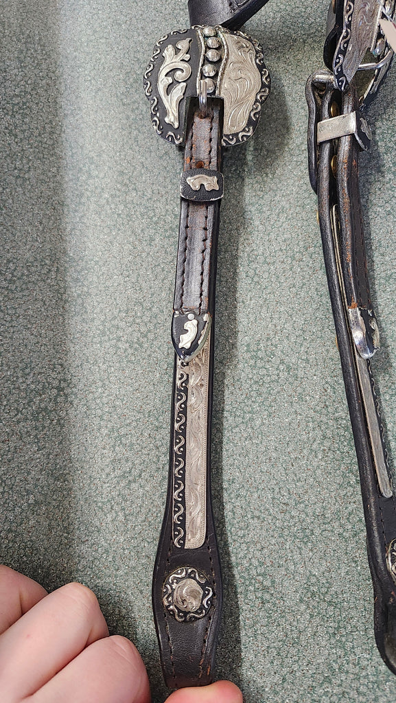 This Dale Chavez Double Ear show Bridle is in excellent used condition. The silver features beautiful engravings, the leather is soft and supple.