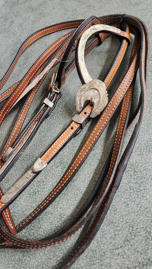 This Dale Chavez Double Ear Western Bridle is in great Condition. The set comes with matching split reins. The silver plates are in excellent used condition as well.