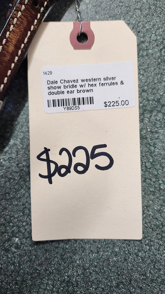 This Dale Chavez Double Ear western show bridle with Ferrules is in great used condition. Features Ferrules that are a unique hexagon shape, the buckles have very detailed engravings.
