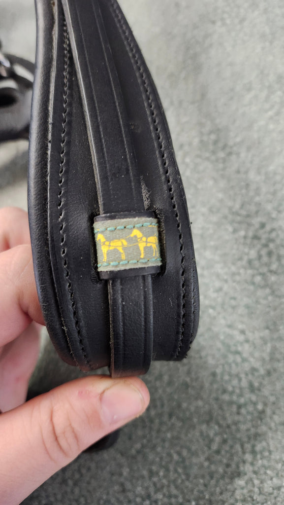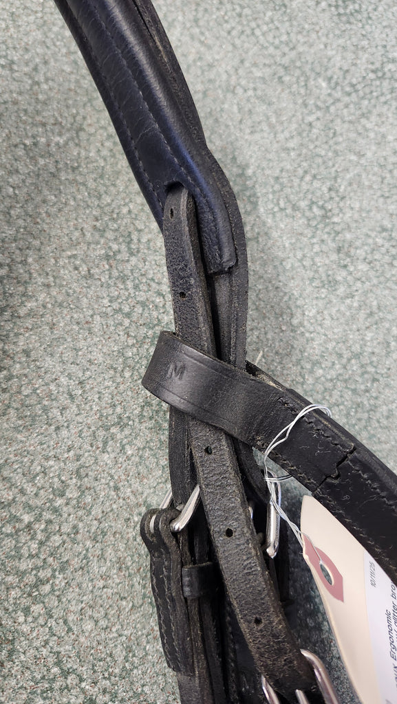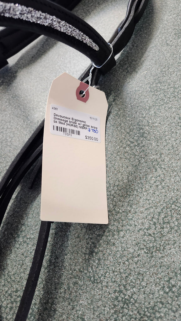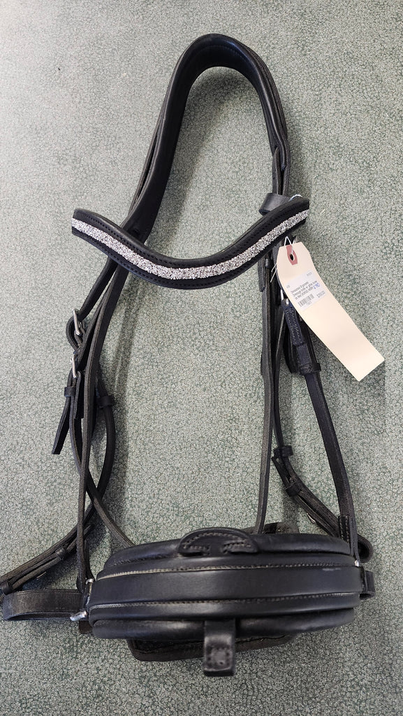 This Devoucoux Ergonomic Dressage Bridle is in excellent used condition. Features a crystal browband with a crank cavason and a removable flash piece.
