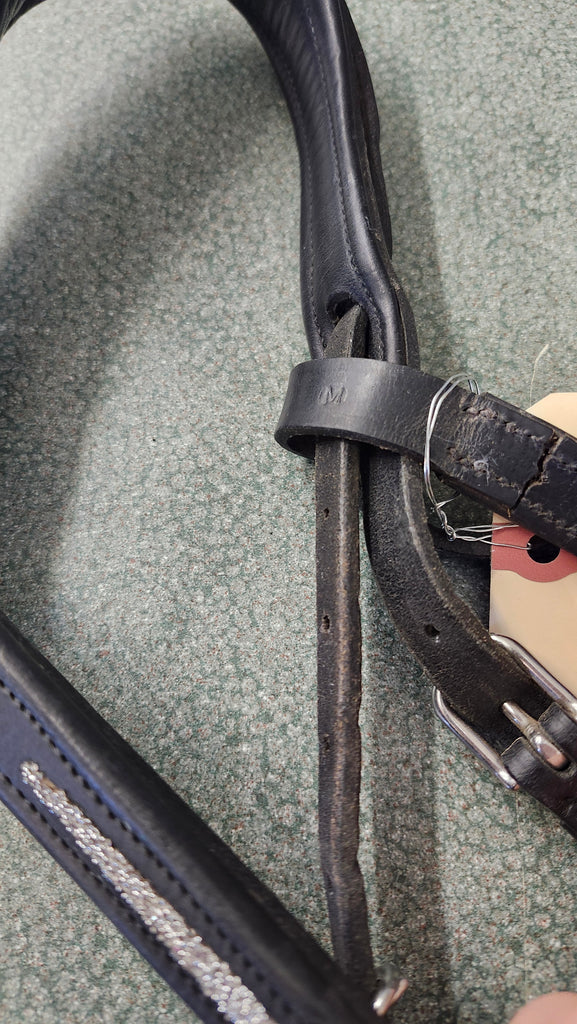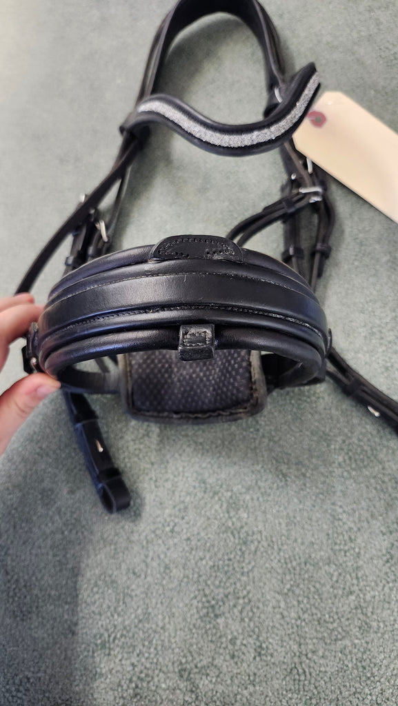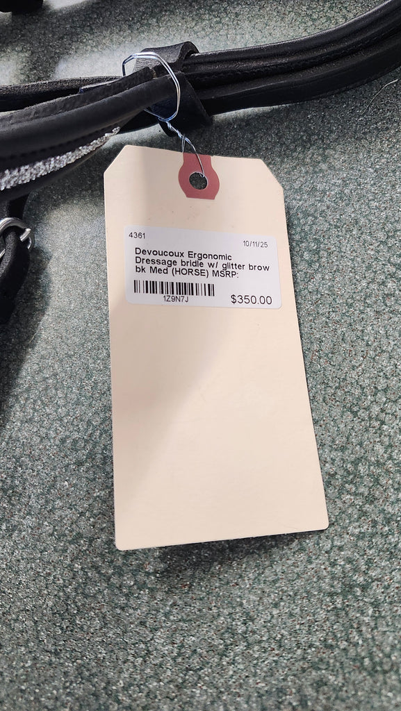 This Devoucoux Ergonomic Dressage Bridle is in excellent used condition. Features a crystal browband with a crank cavason and a removable flash piece.