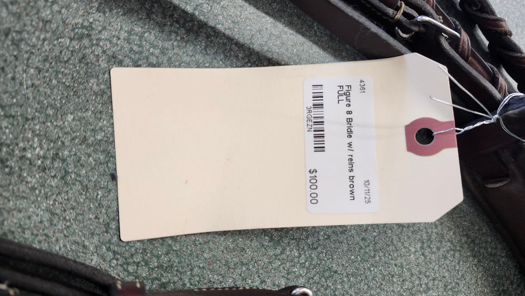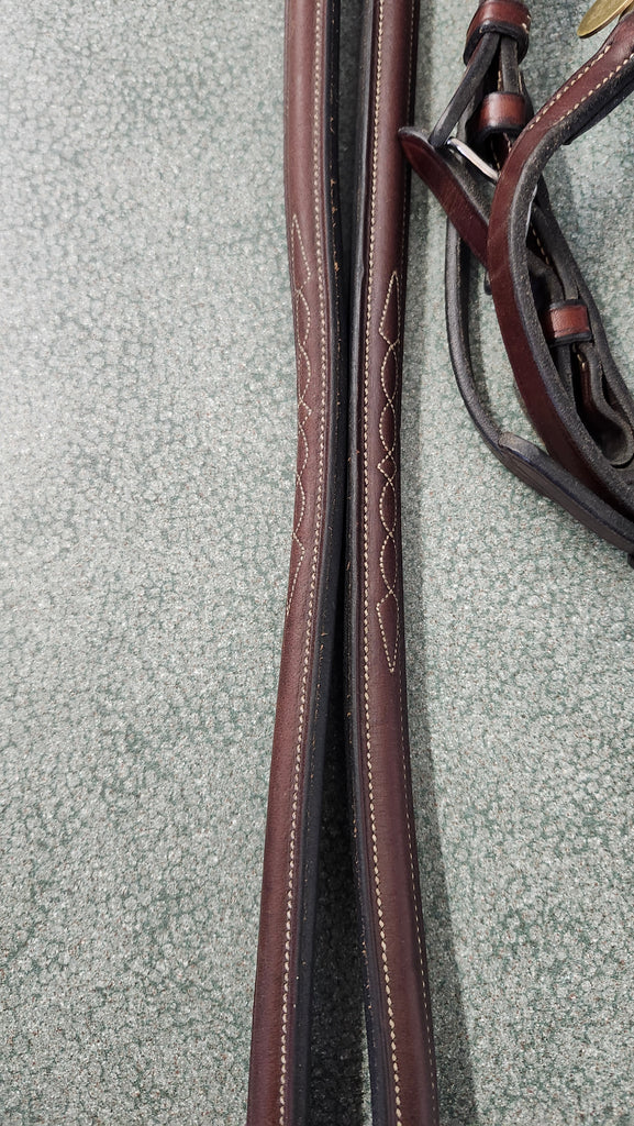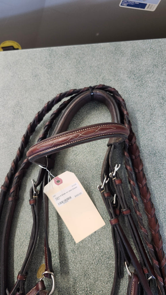 This Figure 8 Bridle With Reins is in great used condition. The bridle features a fancy stitch design and comes with reins.