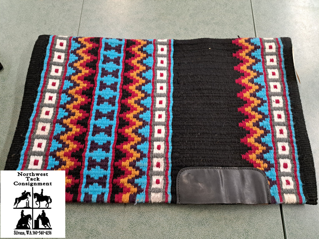 This Horse Show Closet saddle blanket is in excellent condition. It features a black base with a grey, white, blue, purple, pink. and orange patter. As well as a black wear leather.