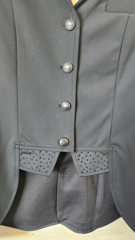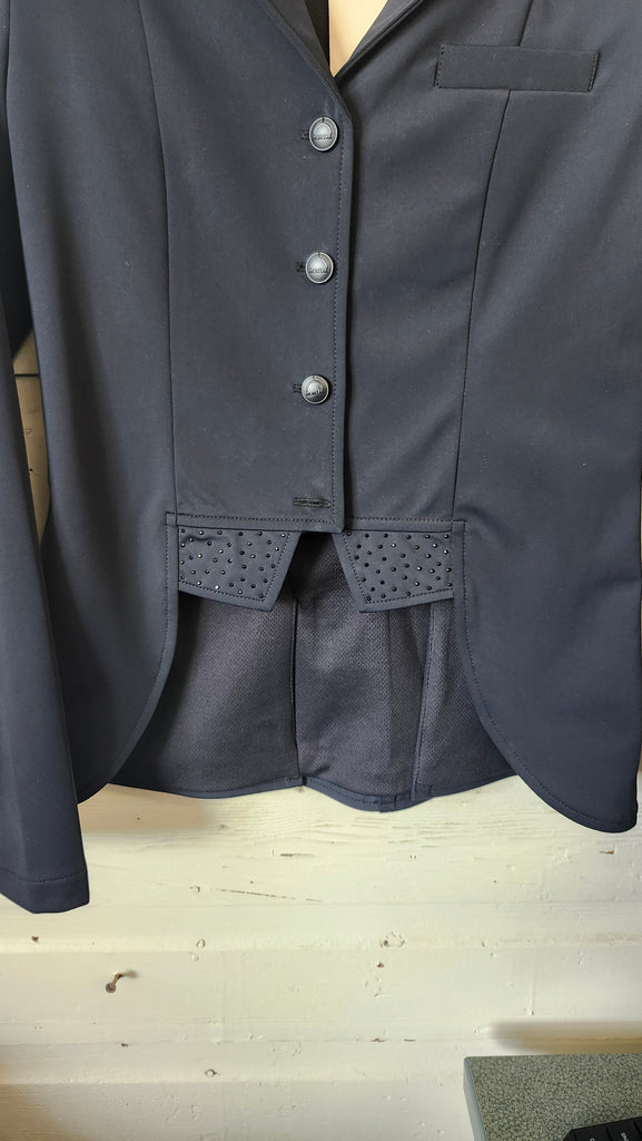 This House of Montar Short Tail Dressage coat is in great used condition. Features rhinestones on the collar, bow on the back as well as the points.