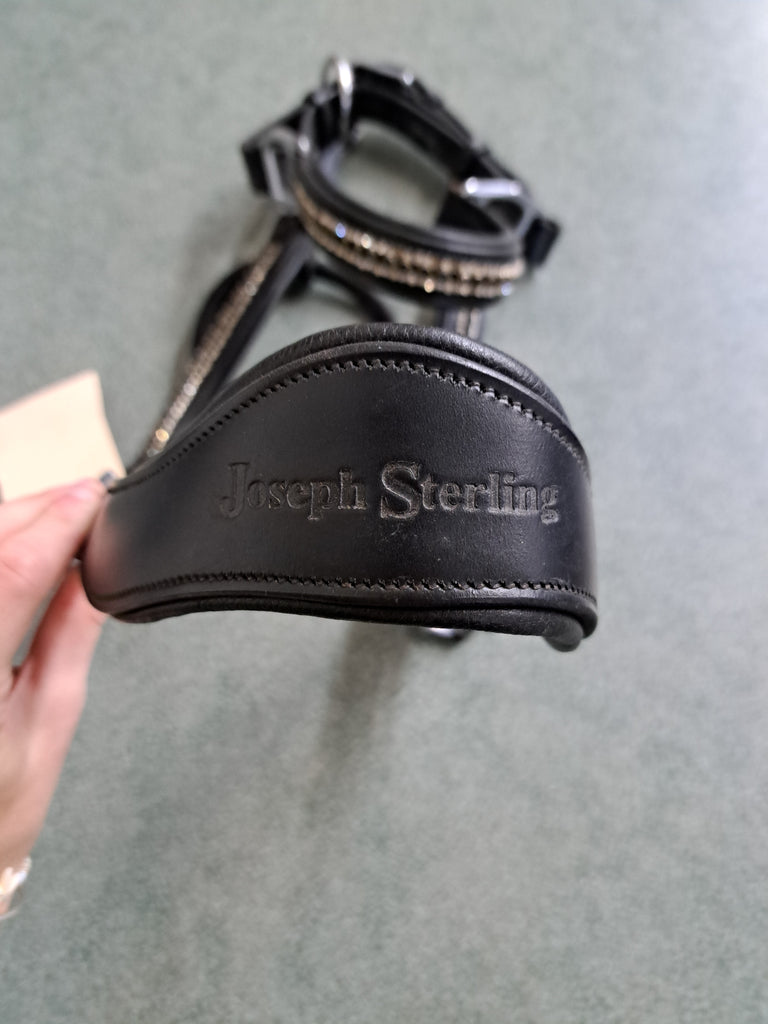 This Joseph Sterling Halter with Crystals is in good used condition. This halter is missing a few stones and the crown piece is shaped and padded.