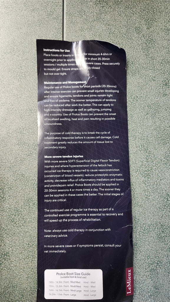 Regularly use ProIce boots for short periods (20-30mins) after intense exercise for preventative purposes to ensure ligaments, tendons and joints remain tight. The sooner the temperature of tendons can be reduced after work the better. This can apply to high-intensity dressage as well as galloping, jumping and XC.