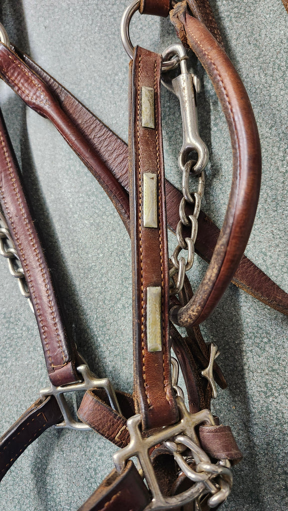 This Mcpherson Western Show Halter is in great used condition. Features a simple design with silver plates.Comes with a matching lead.