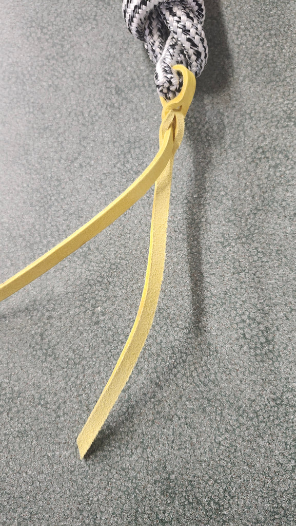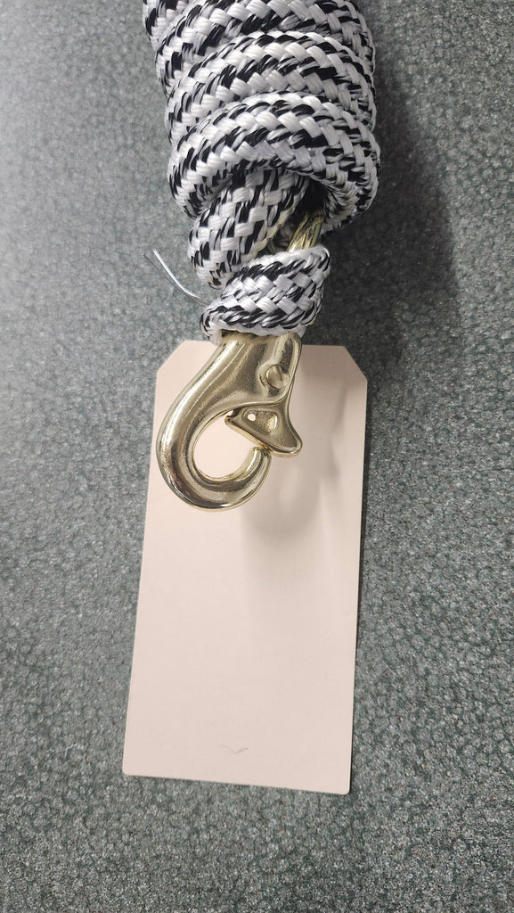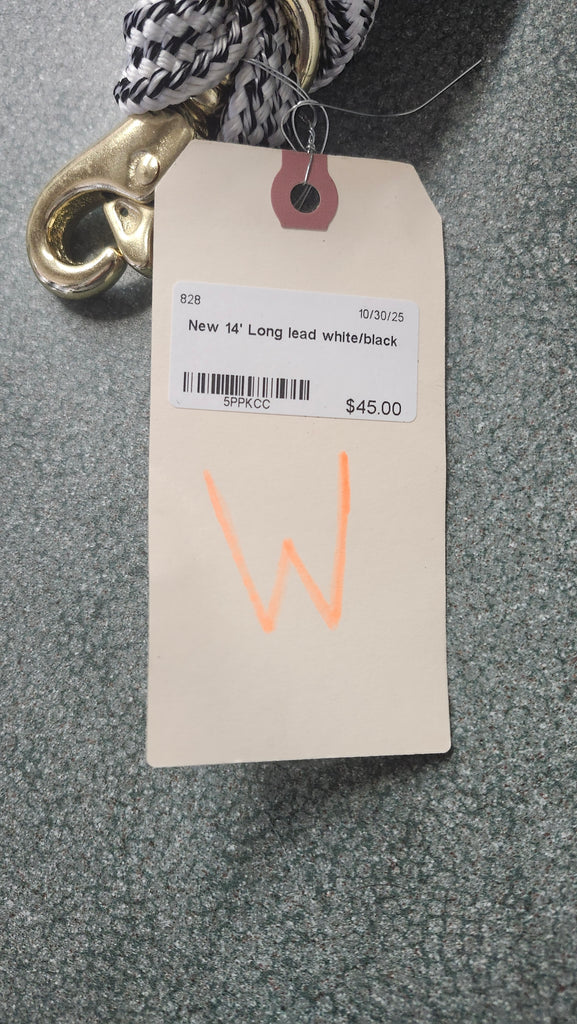 This NEW 14' Long Lead is brand new. The lead is black and white striped with yellow leather popper at the end. Comes with a trigger hook snap designed for automatic closure and a secure latch.