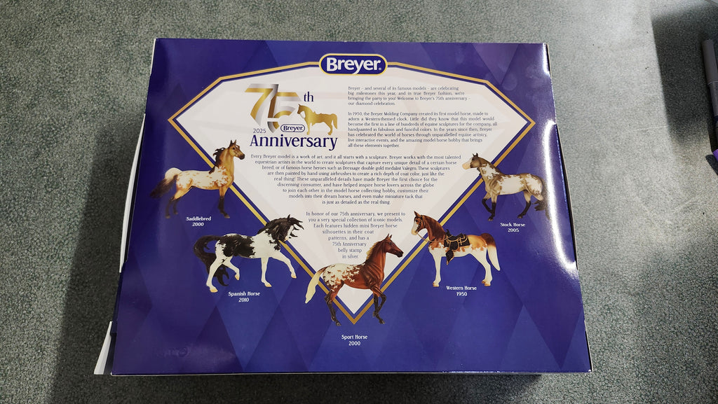 In honor of our 75th anniversary, we present to you a very special collection of iconic models. Each model features hidden mini Breyer horse silhouettes in their coat patterns, and has a 75th Anniversary belly stamp in silver.