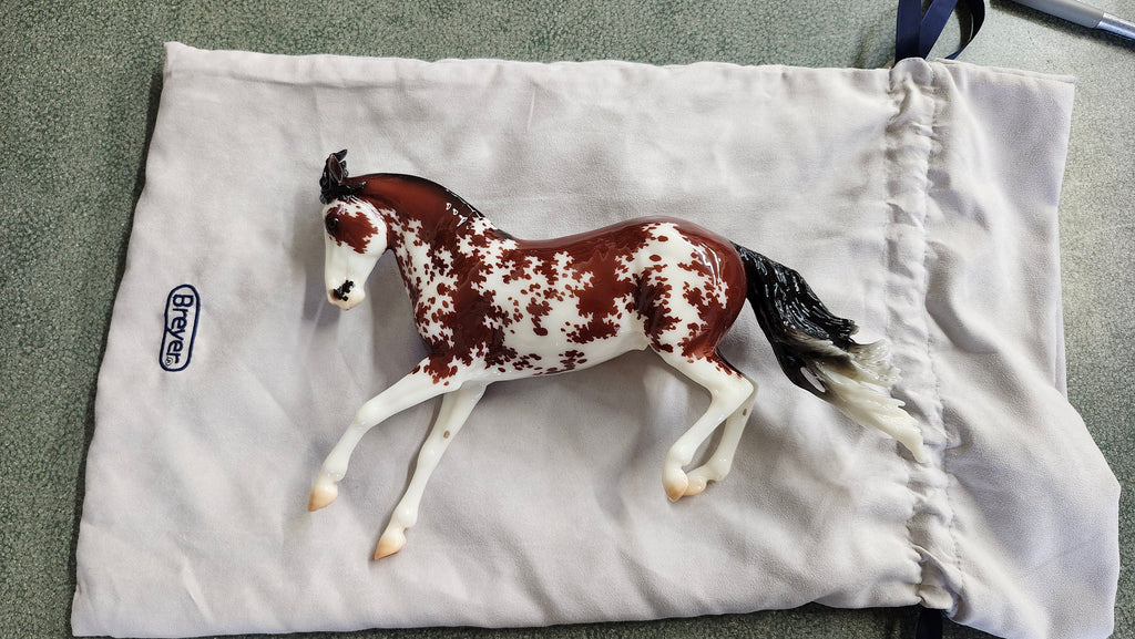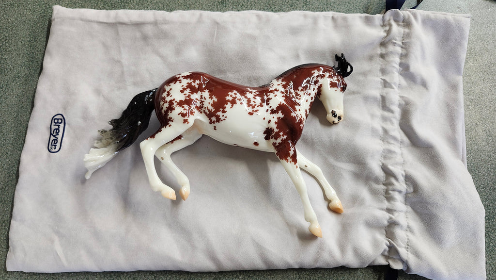 Bandalero was sculpted by Morgen Kilbourn, an artist known for her dynamic poses and faithful breed portrayals. Morgen often works from life, studying the intricacies of her real horses’ movements. Bandalero’s unique pose is a high-speed lead change, a maneuver which is useful in a variety of competitive events. His loud blood bay sabino coat was created by finishwork artist Heather Bullach as her first design for Breyer.