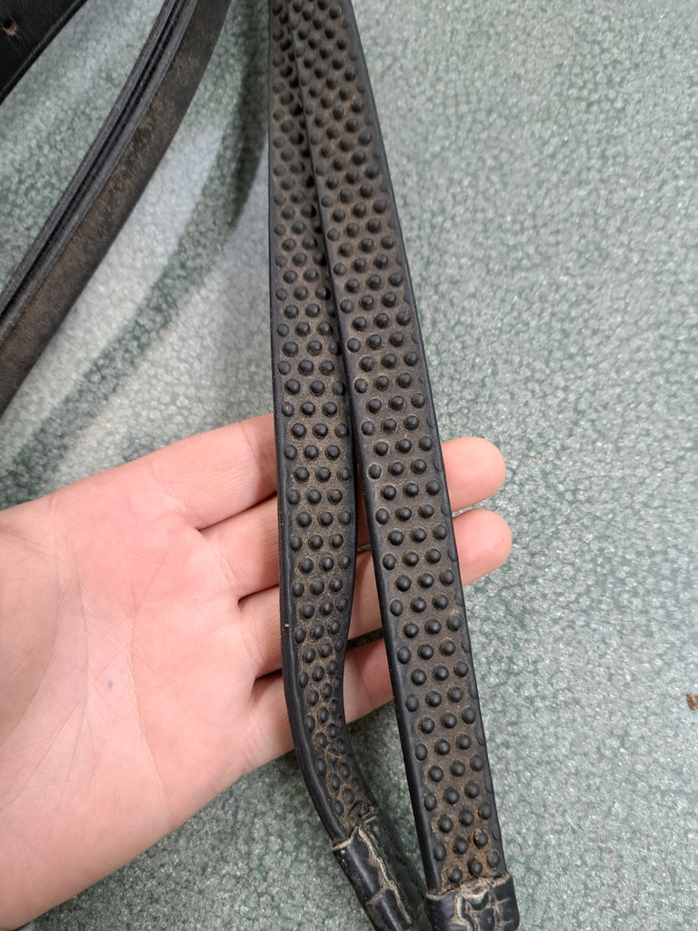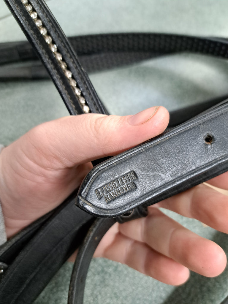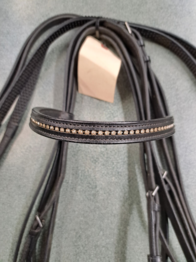 This is a used but still in good condition passier and sohn double bridle which includes a pair of rubber grip reins along with a crystal browband.