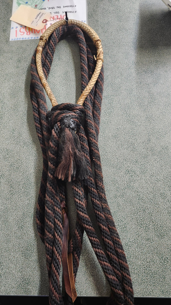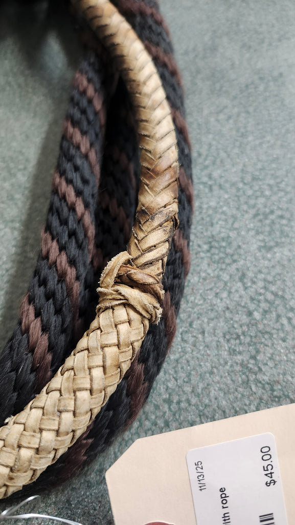 This is a used but still in good condition rawhid bosal with rope reins