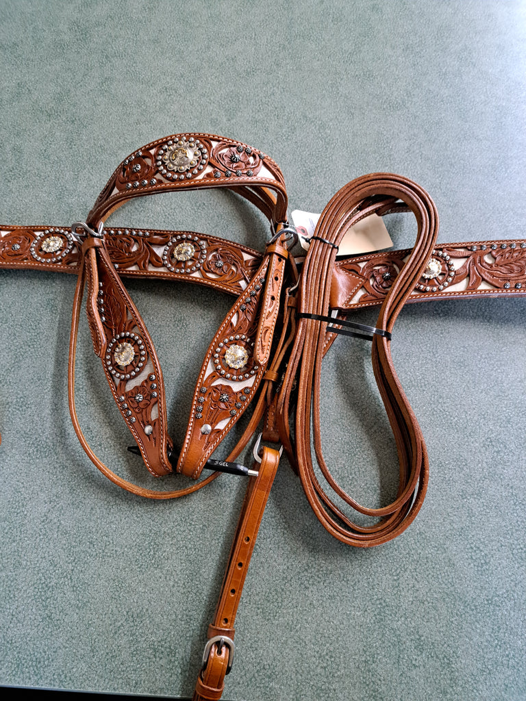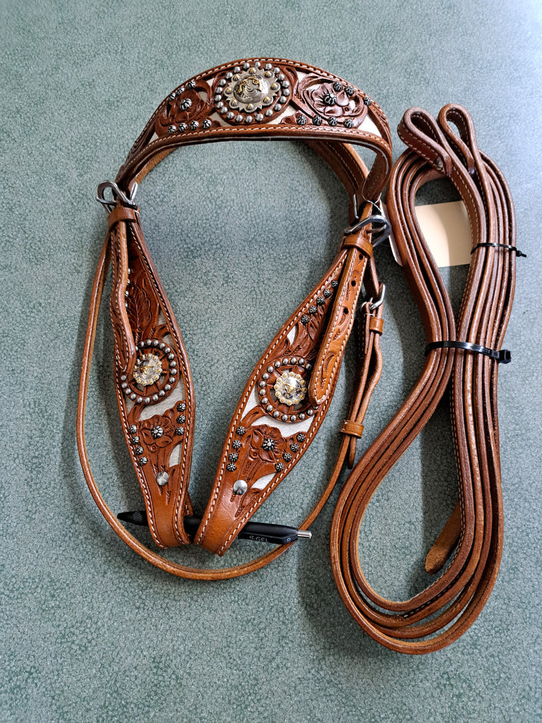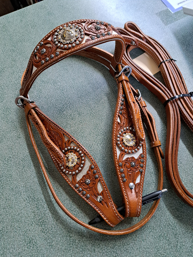 This Showman Tack Set is in great used condition. This set features hide on pattern with tooling, and steerhead conchos. The set inclues borwband headstall, reins, and breastcollar.