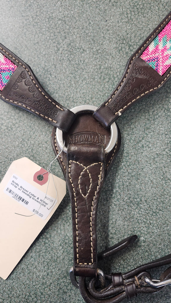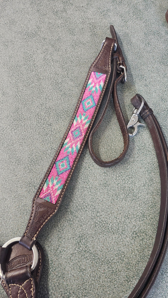 This Showman Western Tack set is in great used condition. The set comes with Headstall, Breast collar, and wither strap. Features a beaded inlay.