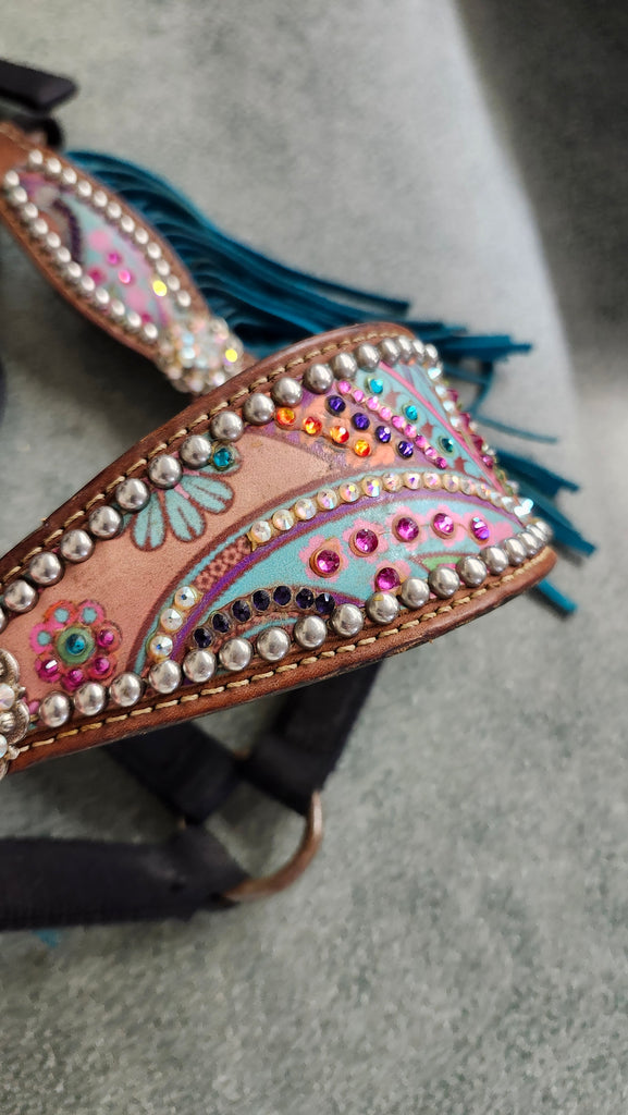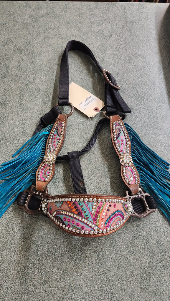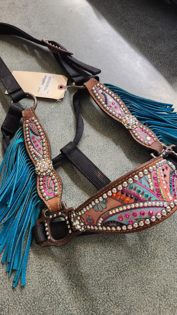 This is a used but still in good condition custom bronc halter. There are very few missing crystals but this can be easily replaced.