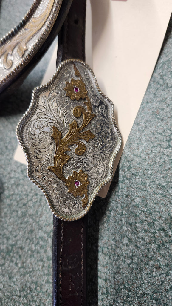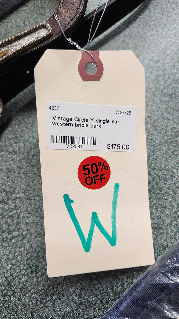 This Vintage Circle Y Single Ear Western Bridle is in great used condition for its age. Feartures Silver buckles with a gold overlay and magenta gems.