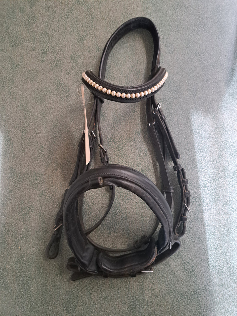 This is a used but still in vert good condition waldhausen dressage bridle. This bridle a pearl browband which is not missing any stones. This bridle could also use a quick clean and it will be in excellent condition.