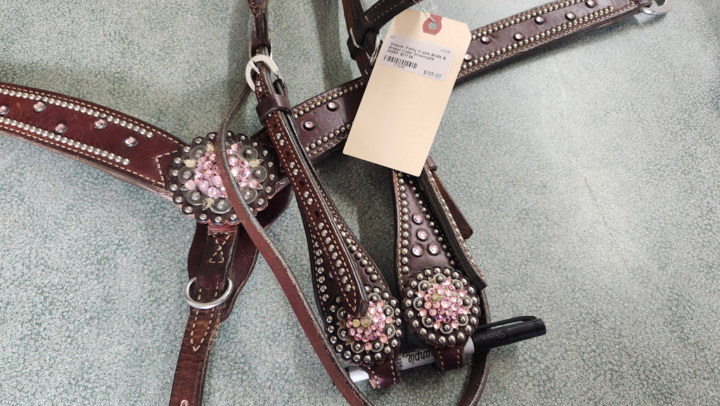 This is a used but still in good condition weaver pretty in pink tack set which features crystals and studs.