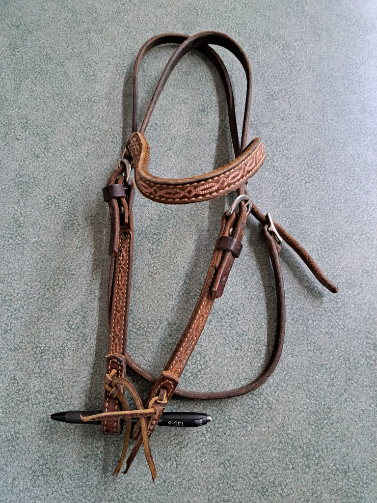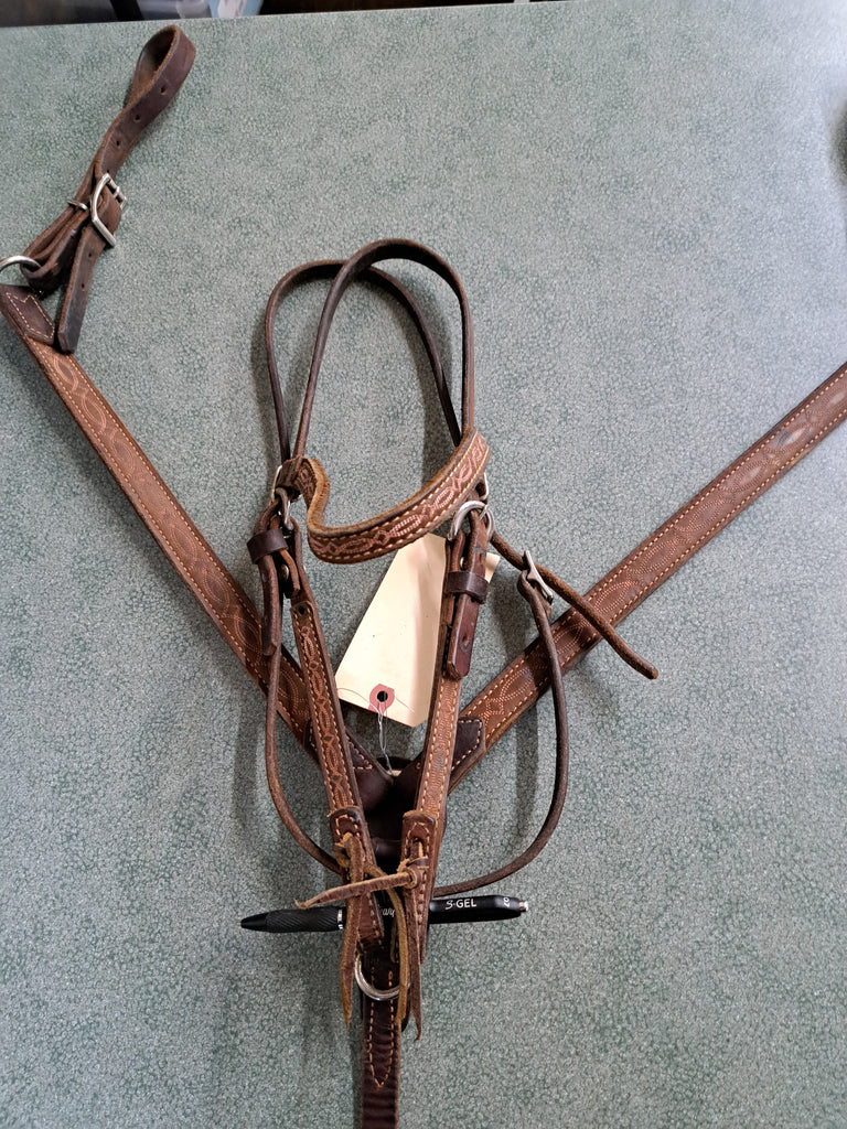 This Weaver Western Tack set is in good used condition. The seat features pink tooled design. This set included a browband headstall and breatcollar.
