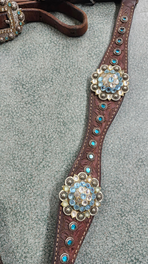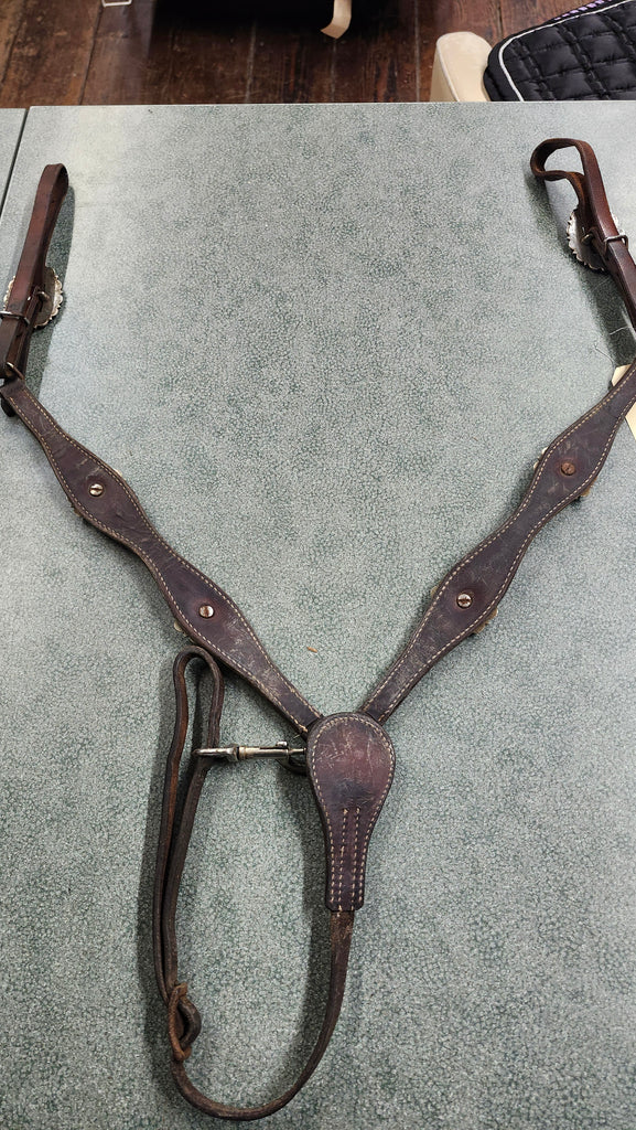 This is a used but still in good condition Western breast collar. There are a few missing crystals which can be easily replaced, this breast collar could also use a quick clean and it will be in great condition.