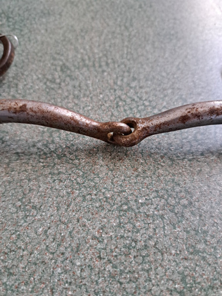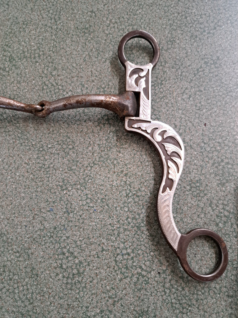 This Western shanked bit with silver accents is in great used condition. The mouth pieces does show some wear.
