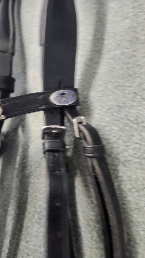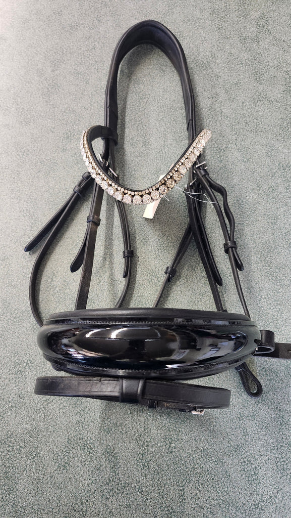 This X-Full Solo Equine Dressage Bridle With Crystal Brow is in good used condition with minimal wear. The noseband is a patent and a crank closure with flash.